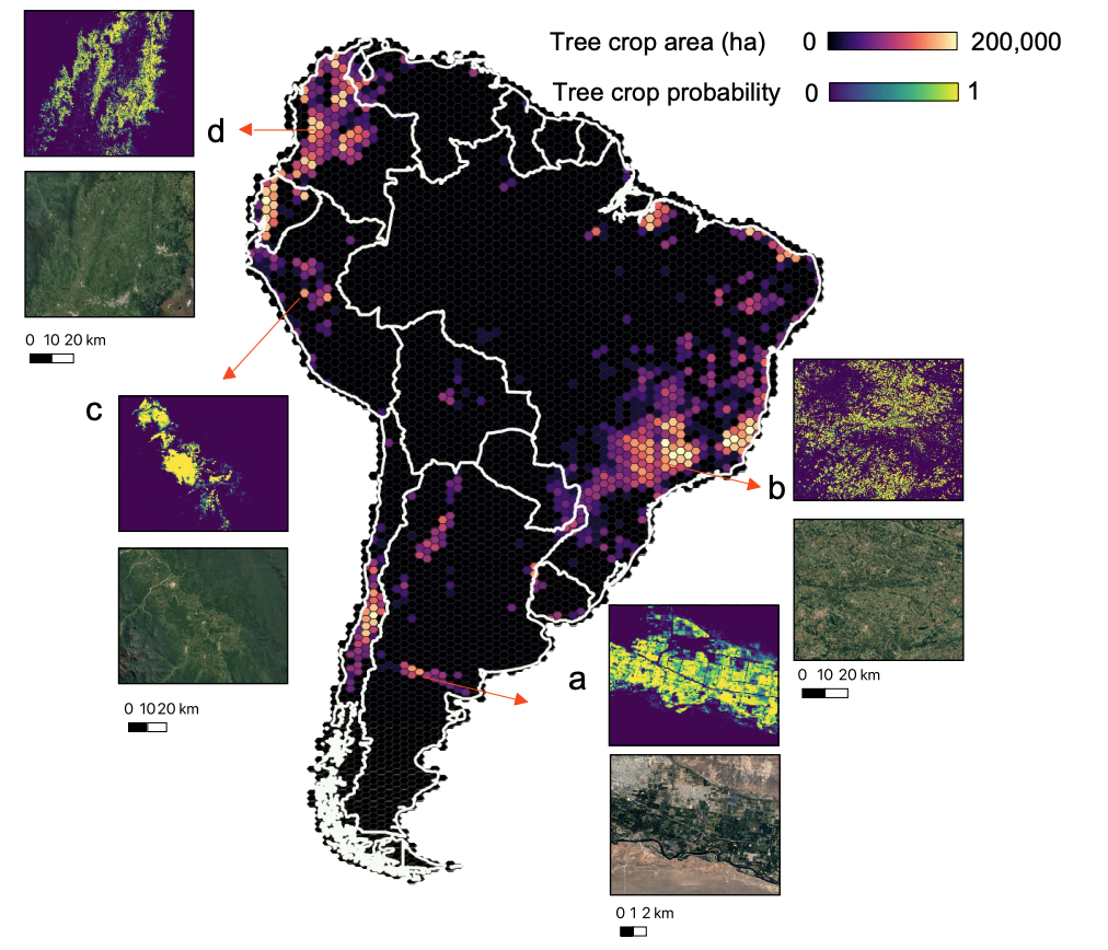 Monitoring tree crop expansion is vital for zero-deforestation policies like the European Union’s Regulation on Deforestation-free Products (EUDR). However, these efforts are hindered by a lack of highresolution data distinguishing diverse agricultural systems from forests. Here, we present the first 10m-resolution tree crop map for South America, generated using a multi-modal, spatio-temporal deep learning model trained on satellite imagery time series. While the map is experimental and carries known uncertainties, it offers a new perspective on the distribution of complex tree crop agricultural system